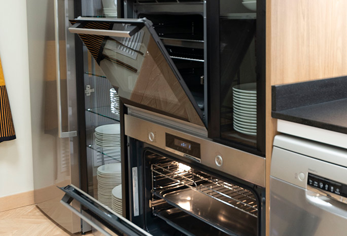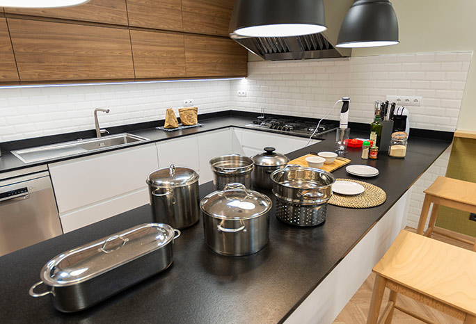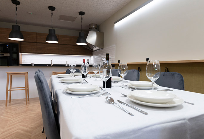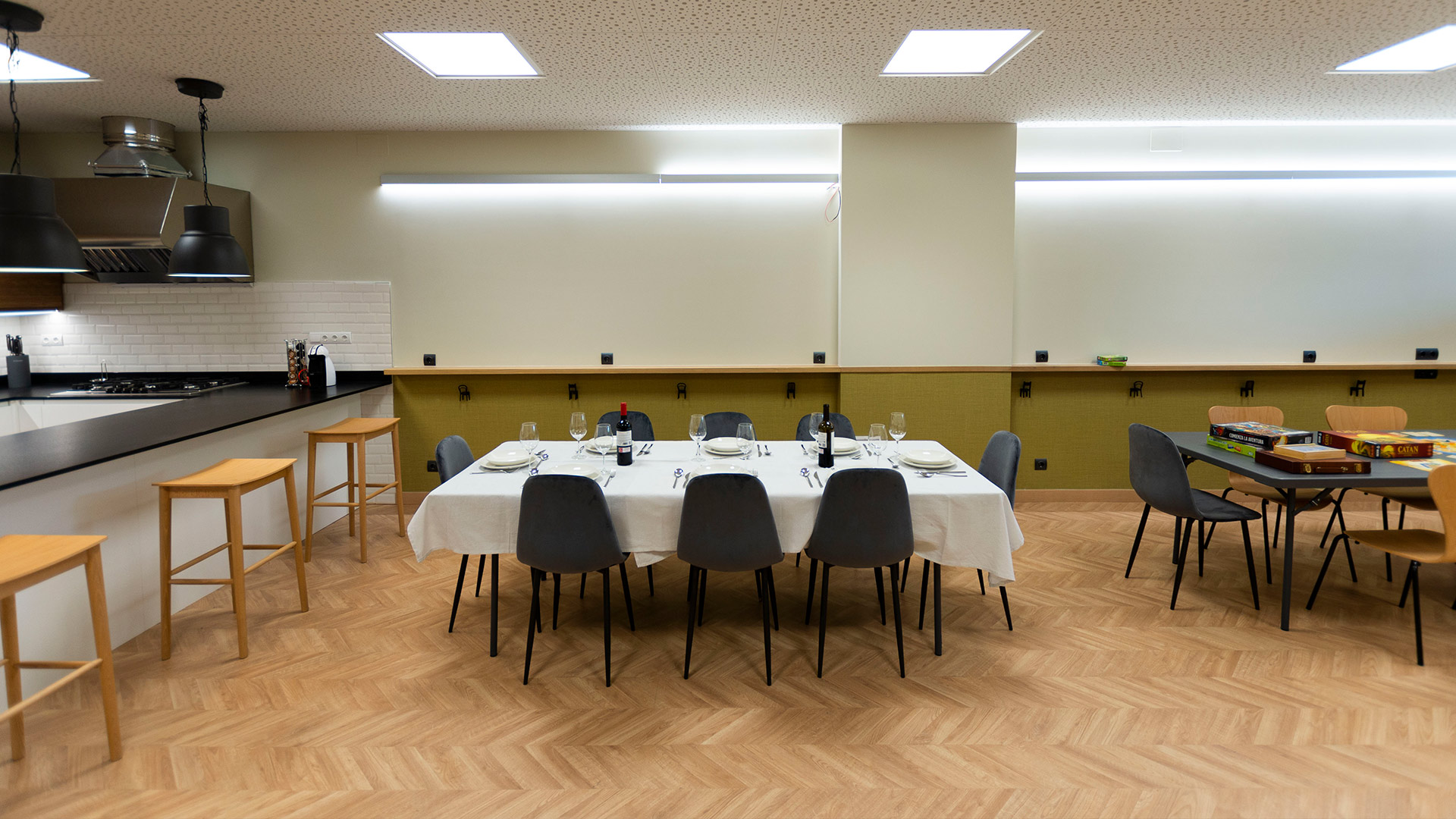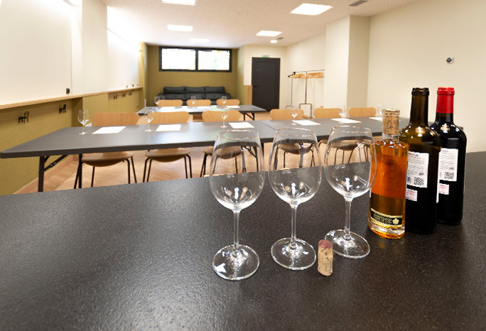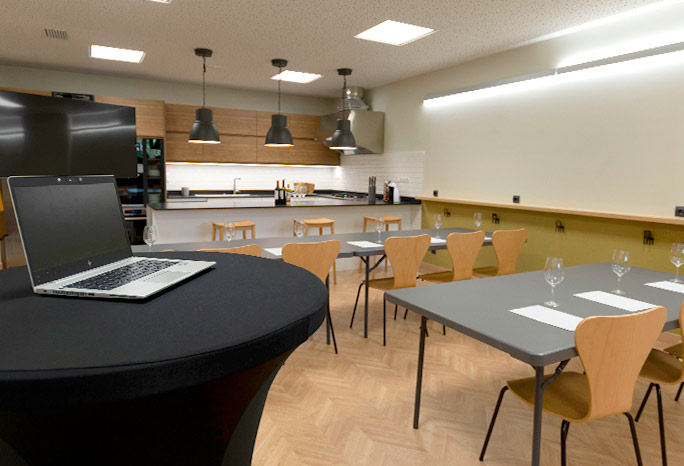 Las catas o talleres de cocina pueden realizarse en taburetes alrededor de la barra en isla si el número de asistentes lo permite, o en la zona amplia del salón disponiendo las mesas hacia la cocina abierta. Está equipada para ofrecer catas de vino, aceite, queso, chocolate,…